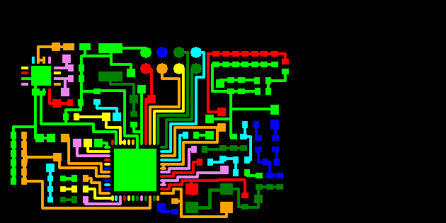 For the syringe printing system we had to do much more processing. The first step was to break the image into continuous regions. This is know as "blob detection". The image below shows a sample circuit after it has been run through our blob detector and each blob is colored a random color.