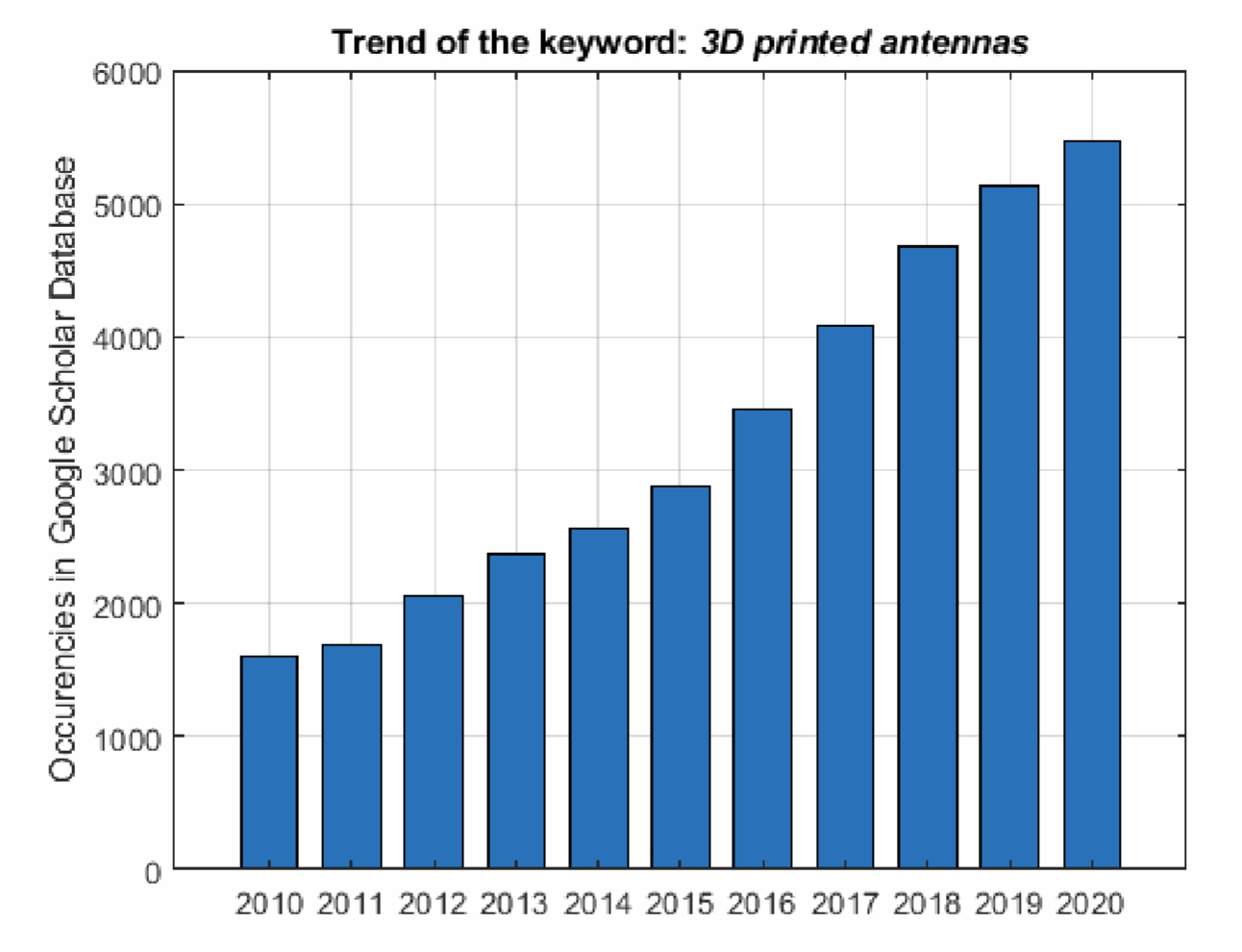 Figure 1: Trend of the term "3D printed antennas" in the Google Scholar database over the last ten years.
